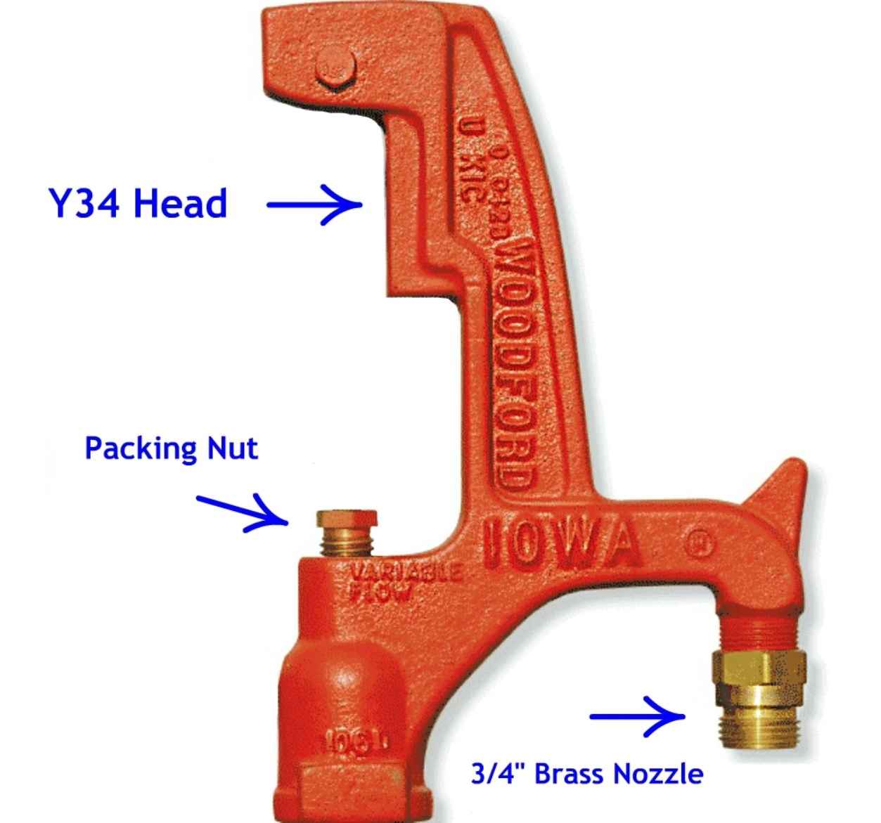 Includes only these parts: (1) Y34 Head (no handle), (1) Packing nut (no packing) and (1) Standard 3/4" brass nozzle