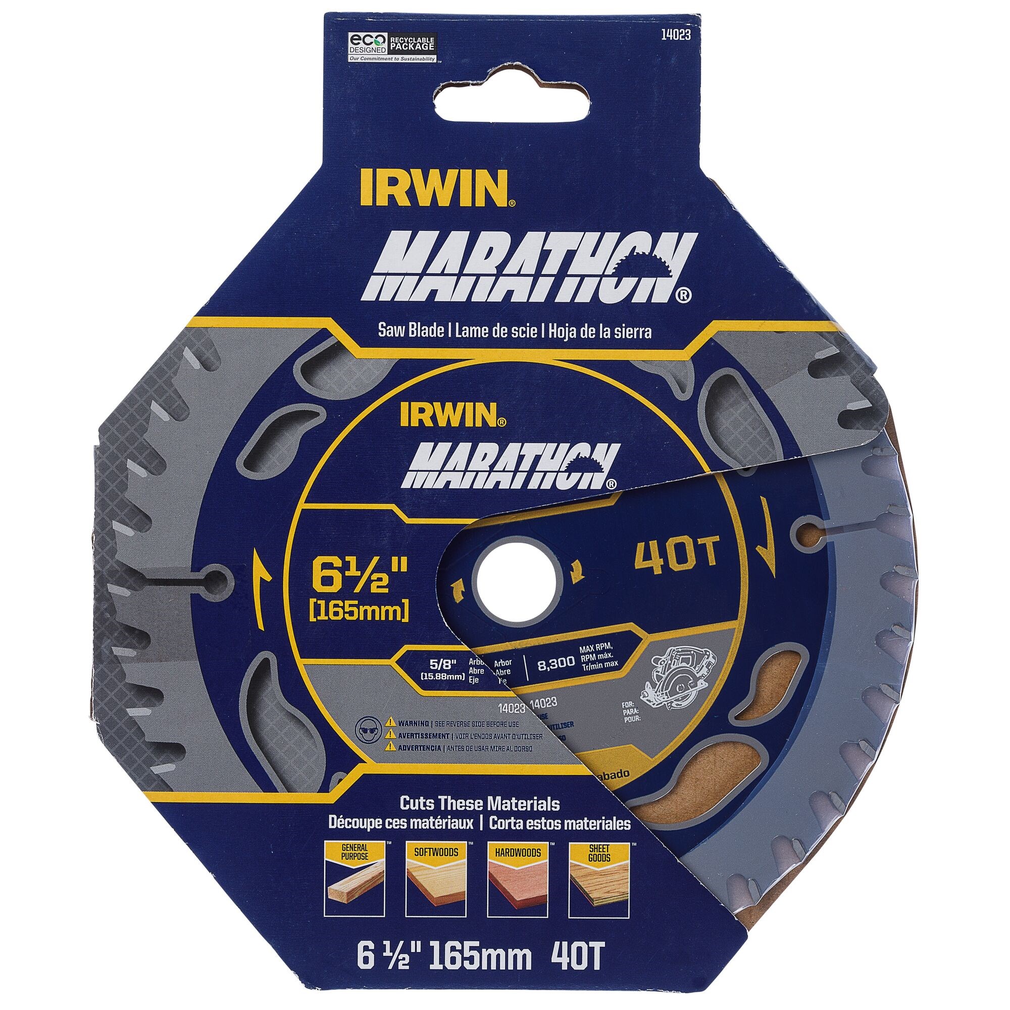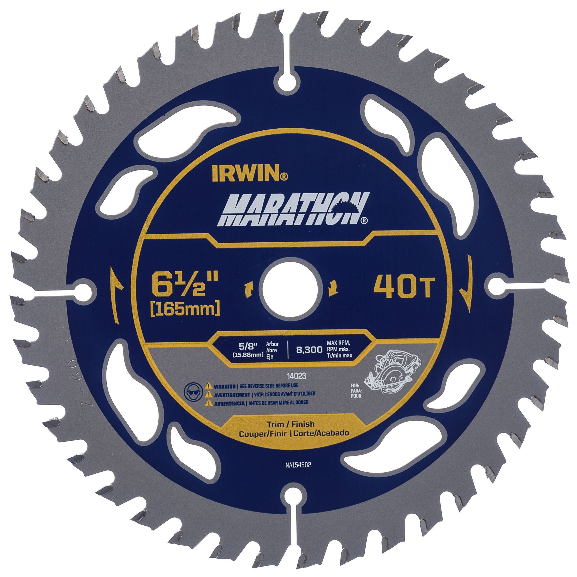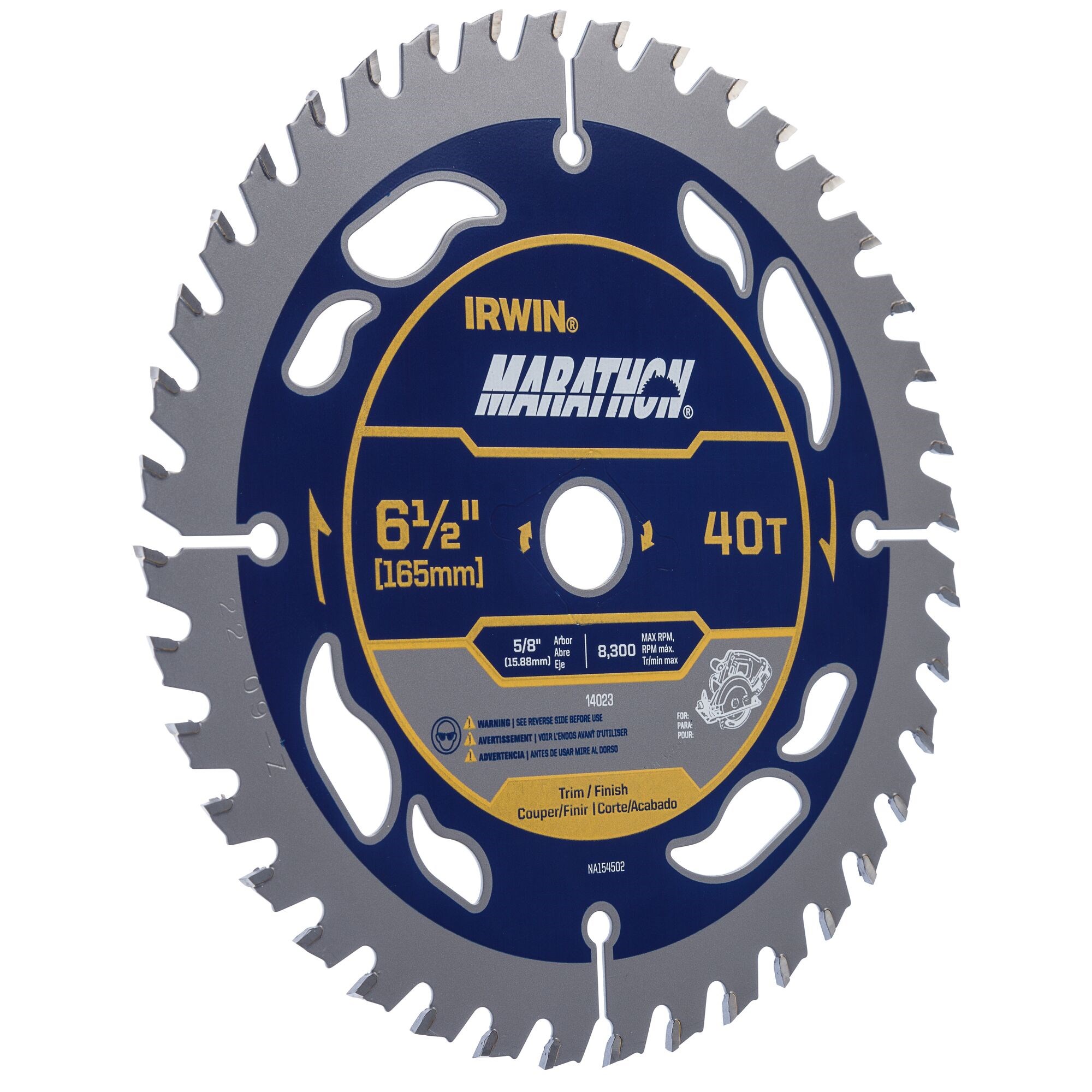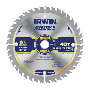 IRWIN MARATHON CORDLESS CIRCULAR SAW BLADE 6-1/2" 40TThe Irwin Marathon cordless circular saw blade features an ultra-thin kerf design that delivers more cuts per battery charge. The 40-tooth count provides fine, smooth cuts in plywood, laminates, and finish work.