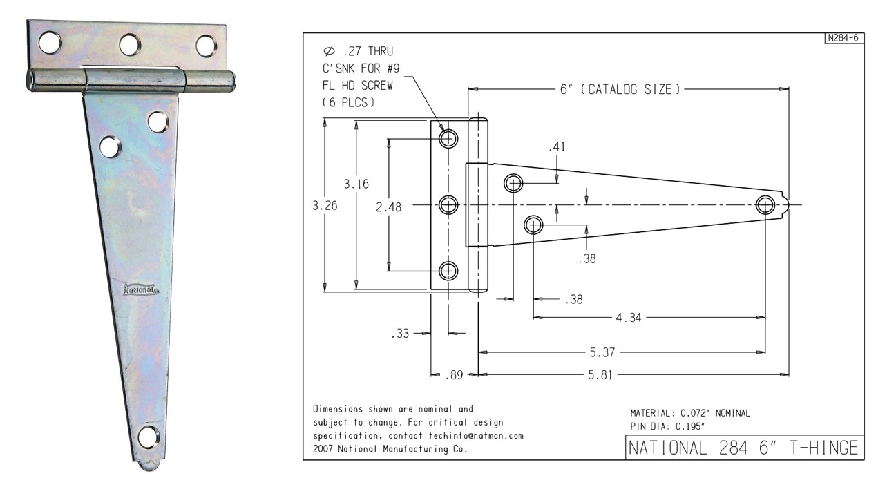 Light Duty T Hinge, Zinc Plated ~ 6"