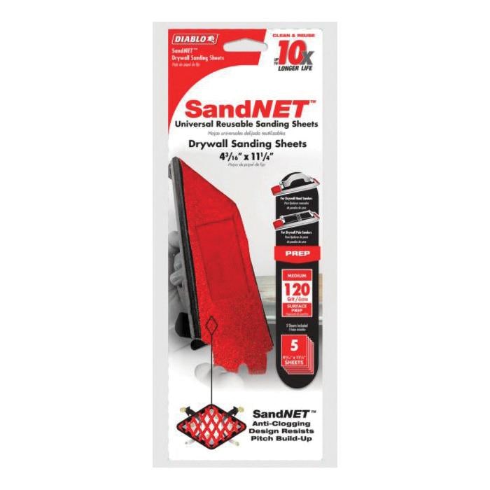 DIABLO SAND DEMON DRYWALL SANDING SHEET - 120G MEDIUM, 5-PACKDiablo Sand Demon reusable drywall sanding sheets feature SandNET technology for up to 10X longer life than standard sandpaper. Five sheets replace up to 50 standard sheets, saving time and money. The 120-grit medium grade is a popular choice for smoothing joint compound and preparing drywall for primer.