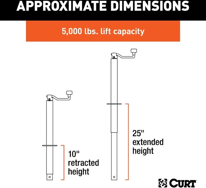 CURT A-FRAME TRAILER JACK WITH TOP HANDLEThis CURT A-frame jack is designed specifically for A-frame trailer tongues and provides reliable support with a 5,000 lb capacity. The top-wind handle makes raising and lowering easy, while the extended 15" travel accommodates various ball heights for flexible towing setups.