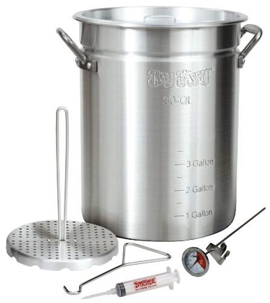 30 quart aluminum, vented lid stockpot cooks a whole turkey in about 45 minutes