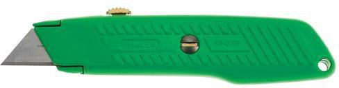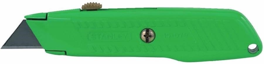 The Stanley 10-179 Hi-Viz utility knife features a high-visibility green case that is easy to spot on the job site. The retractable blade with interlock nose design keeps the blade securely in position during use.
