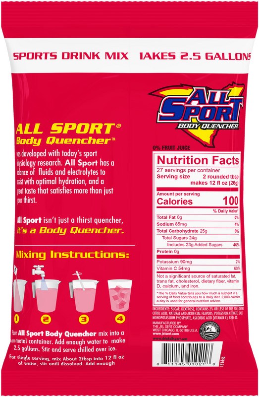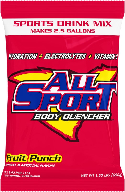 ALL SPORT ELECTROLYTE DRINK POWDER - FRUIT PUNCH, 2.5 GALLONAll Sport electrolyte drink powder in bold fruit punch flavor. Each pouch makes 2.5 gallons of hydrating sports drink packed with electrolytes, potassium, and Vitamin C to help keep workers and athletes performing at their best.