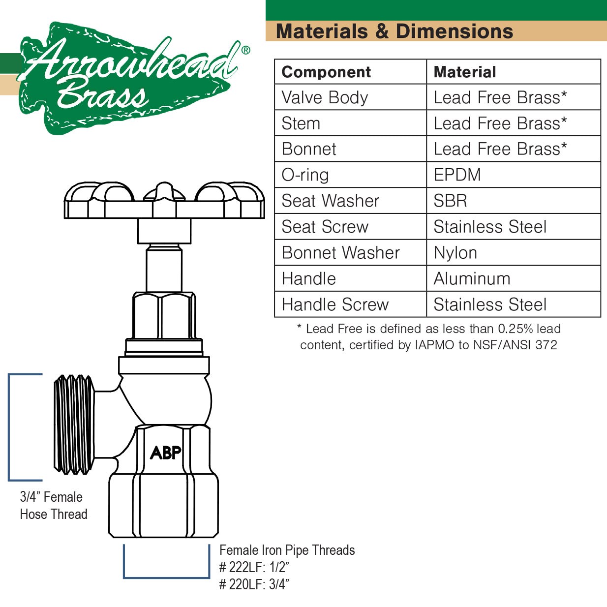 ARROWHEAD BRASS LEAD-FREE BOILER DRAIN - 3/4" FPTThe Arrowhead Brass 220LF lead-free bronze boiler drain features a 3/4" female pipe thread inlet and 3/4" garden hose thread outlet for easy draining of boilers, water heaters, and hydronic systems. The exclusive one-piece O-ring bonnet and stem design eliminates packing nuts for leak-free, low-maintenance service. Rated to 125 PSI and 180 deg F. NSF/ANSI 372 certified and IAPMO listed. Made in the USA with a 3-year limited warranty.