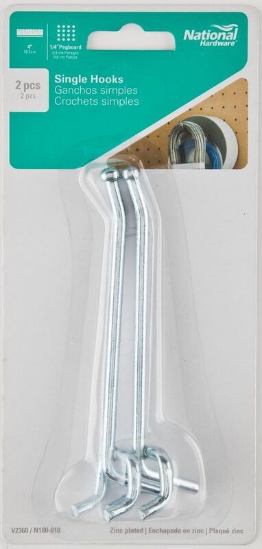 NATIONAL HARDWARE ZINC PEGBOARD SINGLE HOOK - 4"4" single pegboard hook for organizing tools and equipment on standard 1/4-inch pegboard. Made from zinc-plated steel for corrosion resistance and long-lasting durability. Self-installing design makes setup quick and easy. Sold in a 2-pack.