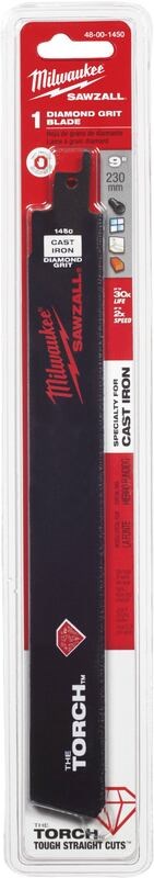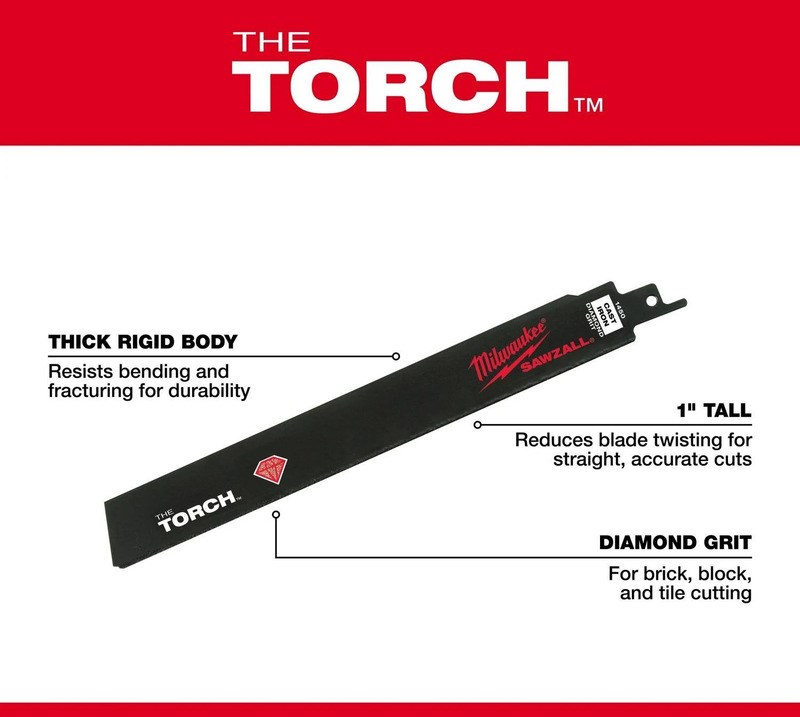 MILWAUKEE THE TORCH DIAMOND GRIT SAWZALL BLADE - 6"The Milwaukee THE TORCH diamond grit blade delivers up to 30x longer life and 2x faster cutting than standard carbide grit blades. Industrial diamond particles are embedded in a high-strength nickel alloy braze on a D6A steel body, providing exceptional cutting performance in hard and abrasive materials.