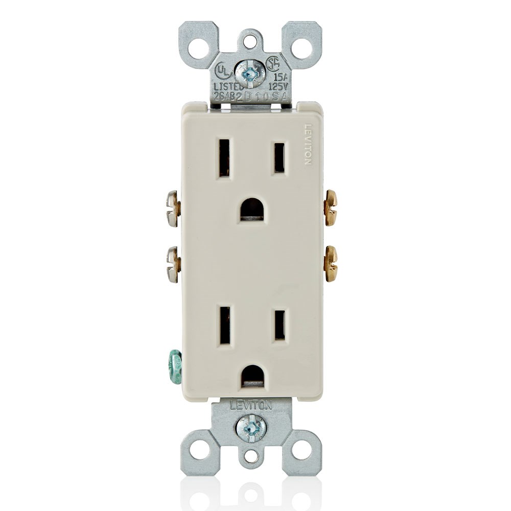DECORA GROUNDED DUPLEX RECEPTACLELeviton S06-5325-TSThe Leviton Decora 15A Light Almond outlet is crafted from high-quality thermoplastic for durability and aesthetic appeal. It features effortless installation options, reliable conductivity, and compatibility with standard plugs and devices.
