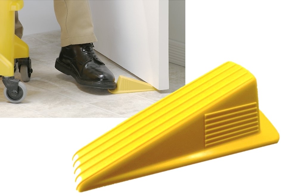 The bright yellow color makes it easy to spot while the rubber construction lends to durability. The large footprint grips on rough or uneven surfaces and large heel holds doors with clearances up to 2 in. from floor surface.