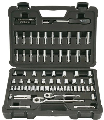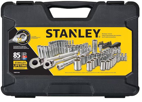 STANLEY 85-PIECE SOCKET SETThis Stanley 85-piece mechanics tool set (STMT71651) includes a comprehensive selection of 1/4" and 3/8" drive sockets, ratchets, and accessories. Chrome vanadium forged construction delivers torque, strength, and durability for professional and DIY use.