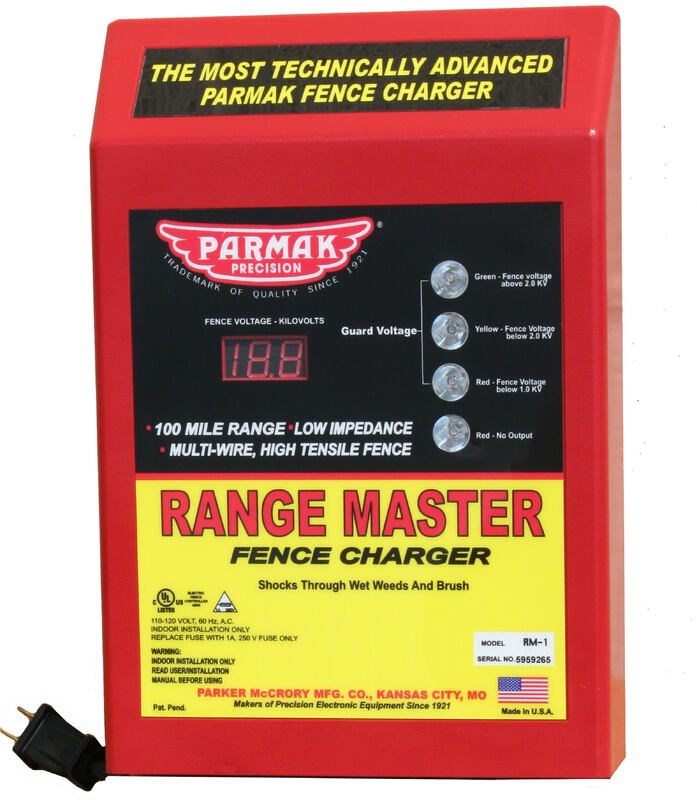 PARMAK RANGEMASTER RM-1 ELECTRIC FENCE CHARGER - 100 MILEThe Parmak Rangemaster RM-1 is a low-impedance electric fence charger designed for large pastures, charging over 100 miles of fence with 6.6+ joules of stored energy. The built-in digital performance meter displays live fence voltage, while multi-color LED indicator lights show fence condition at a glance. Features an audible and visual shut-down alarm that alerts you when the fencer is malfunctioning.