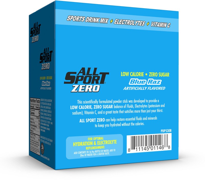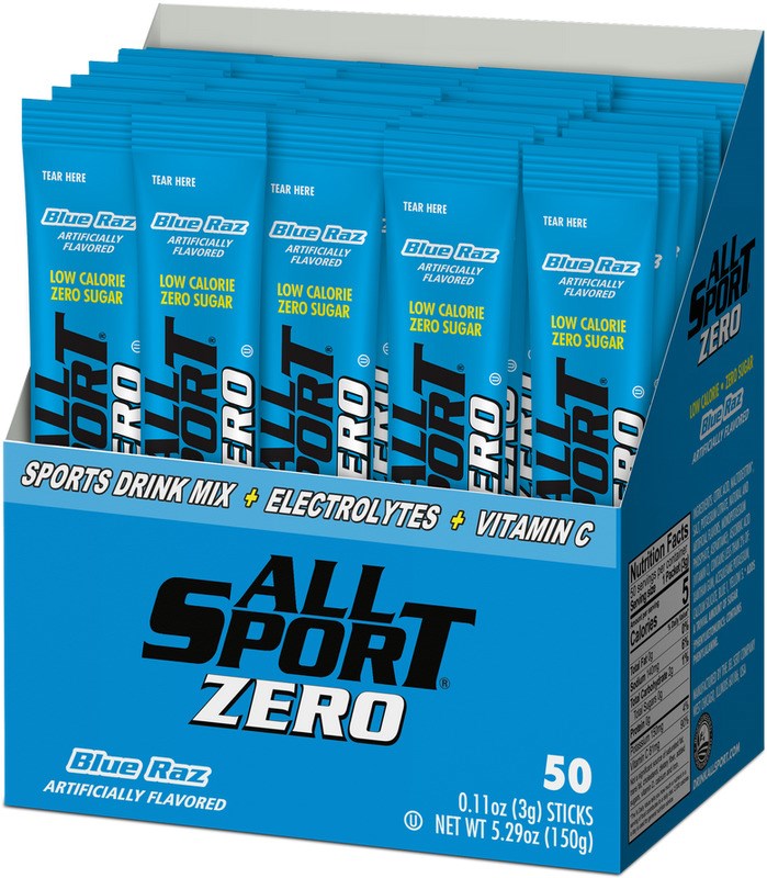 ALL SPORT ZERO POWDER HYDRATION STICKS - BLUE RASPBERRY, 50-PACKAll Sport Zero Powder Sticks are a zero-sugar electrolyte drink mix designed to keep you hydrated during workouts, outdoor work, and heat-stress environments. Each stick delivers 2X the potassium and half the sodium of leading sports drinks, with only 5 calories per serving.