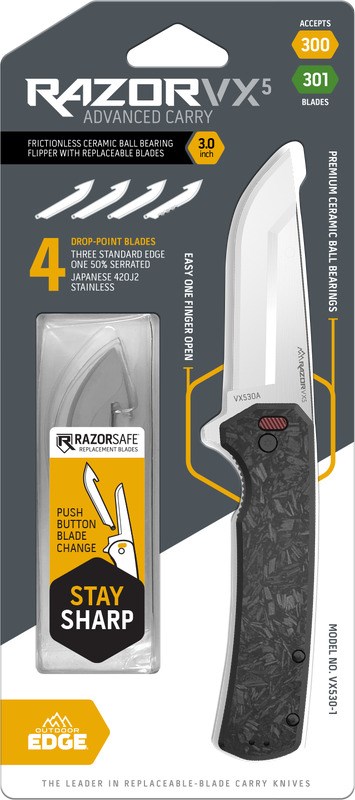 OUTDOOR EDGE RAZORSAFE CARRY KNIFE - 3" BLACKA versatile everyday carry knife featuring the patented RazorSafe replaceable blade system. Push-button blade changes let you swap to a factory-sharp edge in seconds, ensuring peak cutting performance at all times.