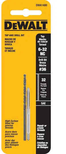 DEWALT DRILL AND TAP SET - 6-32 NCCreate and repair 6-32 NC (National Coarse) internal threads in metal with this DeWalt 2-piece drill and tap set. Includes a matched #36 black oxide drill bit and high-carbon steel tap for precise, efficient thread cutting.