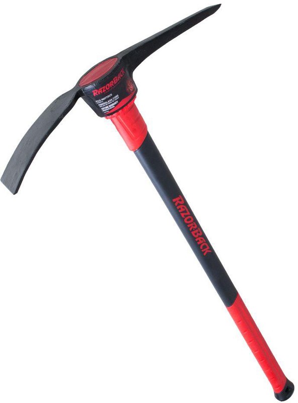 RAZOR-BACK 5 LB. FIBERGLASS HANDLE PICK MATTOCKSafe-Lock: steel anchored for maximum head security. Triple layer over-strike protection. Machined finished on head. Soft grip handle and baseball bat shaped end.