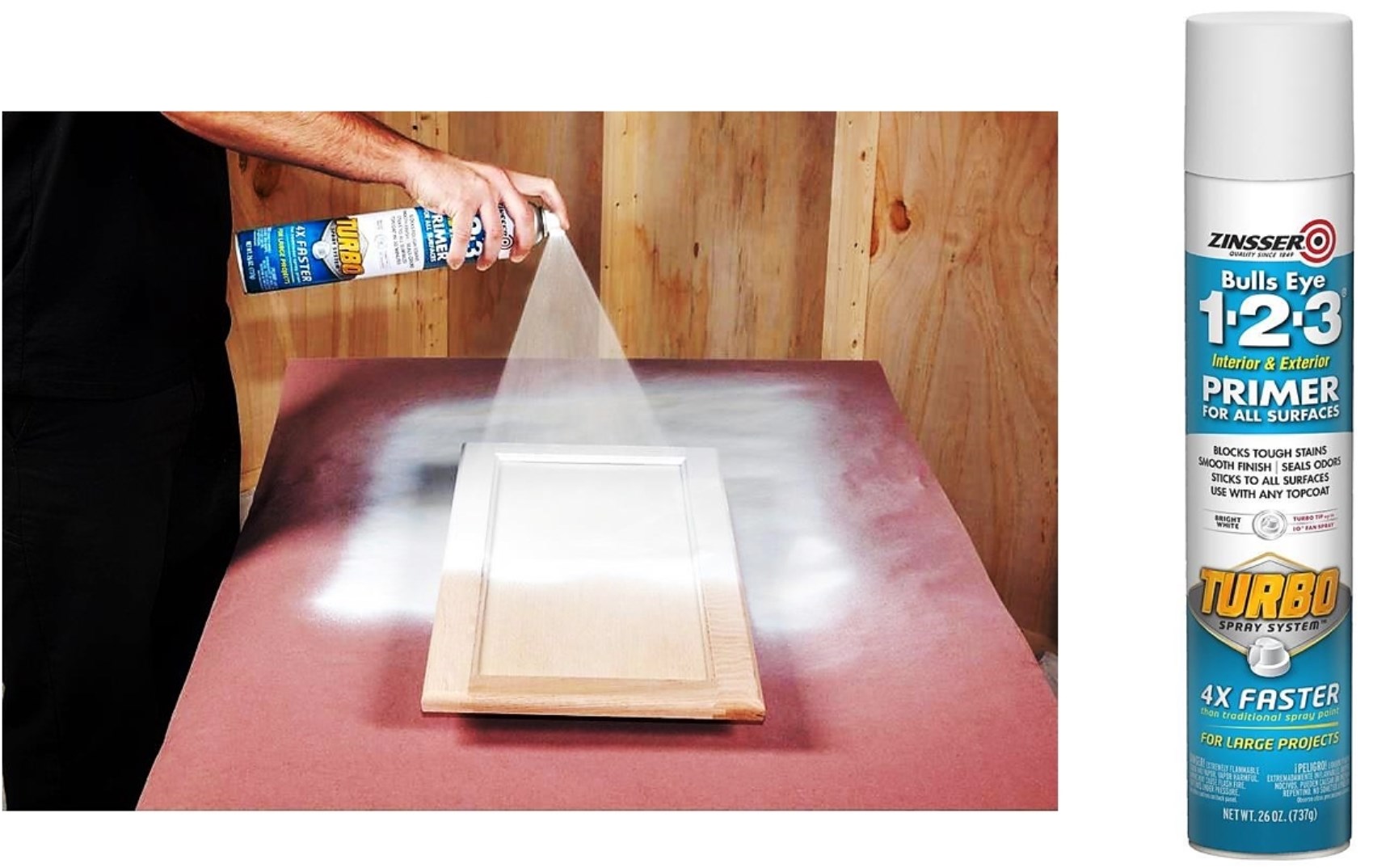Zinsser Bulls Eye 1-2-3 Turbo Bright White Interior/Exterior Primer Spray is an all surface primer designed to block tough stains, seal odors and create a smooth finish for topcoat. Prime large objects in no time with a powerful spray that provides professional spray equipment results without the cleanup.