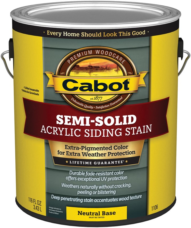 Cabot Semi-Solid Acrylic Stains are richly pigmented, penetrating, 100% acrylic resin-based stains that are unique to Cabot. They provide greater hiding power and color than semitransparent stains, yet their attractive flat finish highlights the natural beauty of the wood’s texture.
