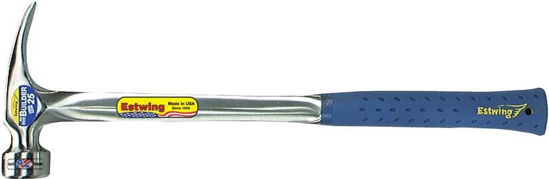 Estwing's Exclusive BIG BLUE Pro Line Solid Steel Builder Series Hammer has a longer handle for more striking power. The head and handle are forged in one piece. Their exclusive Shock Reduction GripĀ® is molded on and offers the utmost in both comfort and durability, while reducing vibrations caused by impact.