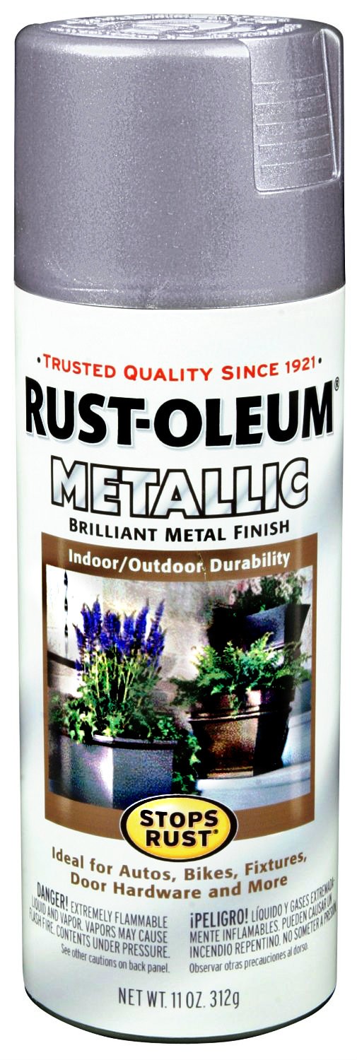 Rust-Oleum Metallic Spray provides a brilliant metal finish with weather-resistant metallic flakes. Provides excellent rust protection for heavily handled objects, such as autos, bikes, fixtures, door hardware and more. It features a comfort tip with a wider finger pad and an any-angle spray feature that allows you to spray in any direction, even upside-down.
