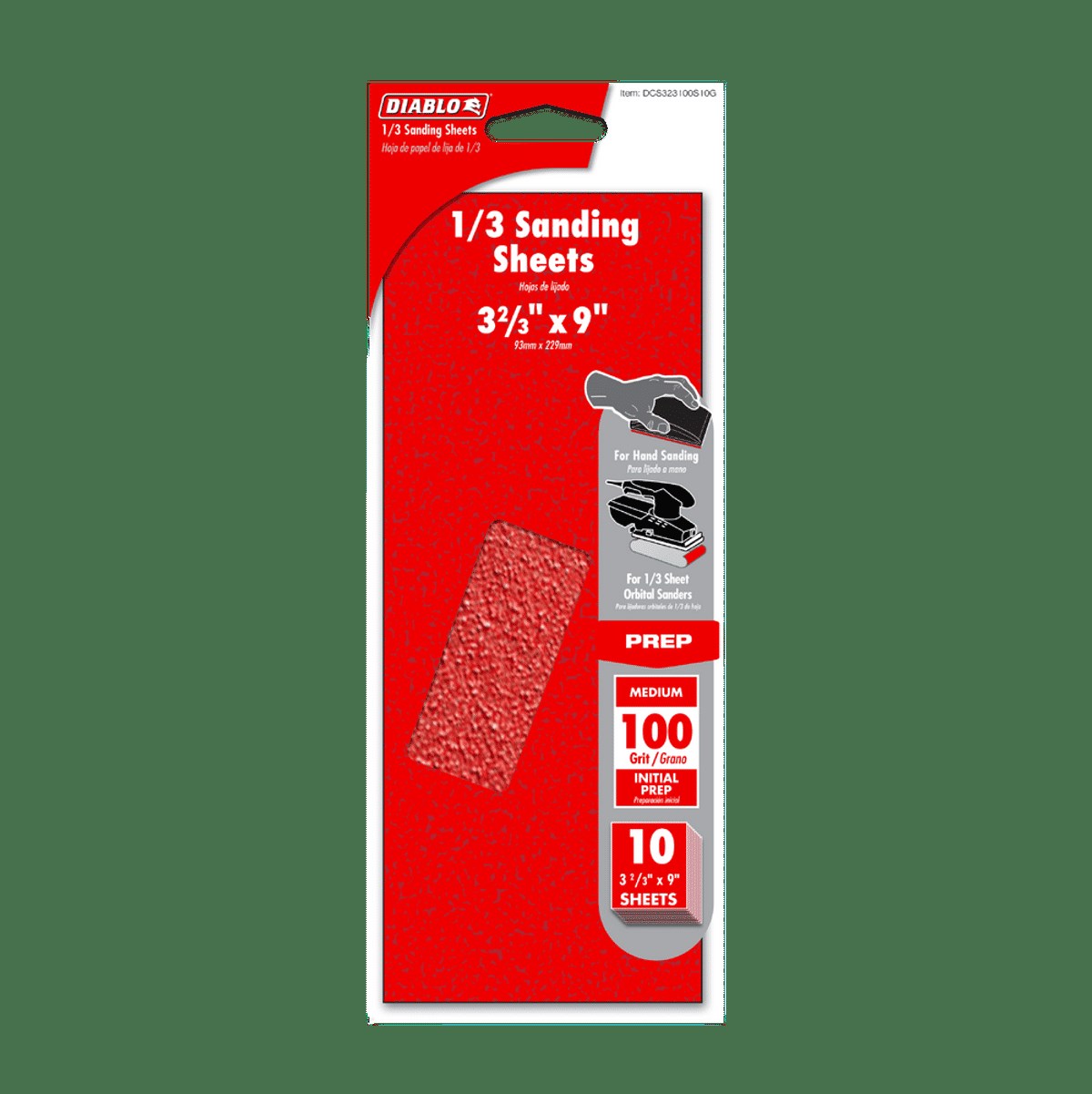 DIABLO 1/3 SHEET SANDPAPER, 100 GRIT - 10PKDiablo's premium 1/3 sheet sandpaper delivers fast, efficient sanding for 1/3 sheet orbital sanders. The 100 grit medium abrasive is a versatile choice for general-purpose sanding, surface smoothing, and light stock removal. Built with a ceramic grain blend that cuts faster and lasts longer than conventional aluminum oxide.