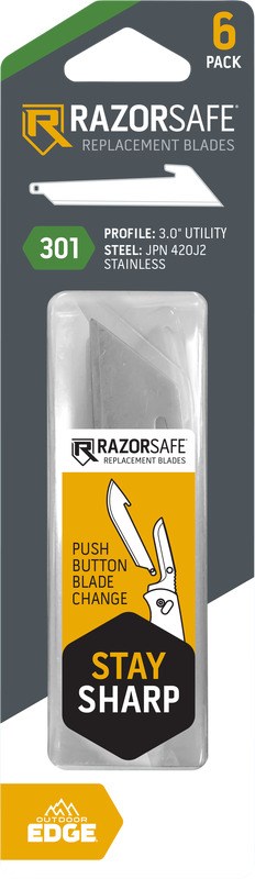 OUTDOOR EDGE 3" RAZORSAFE UTILITY BLADES - 6PKReplacement 3" utility blades for Outdoor Edge RazorSafe knives. Made from Japanese 420J2 stainless steel with a straight-edge utility profile for precision cutting of rope, cordage, and materials.