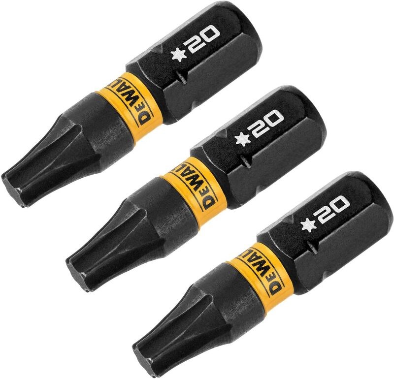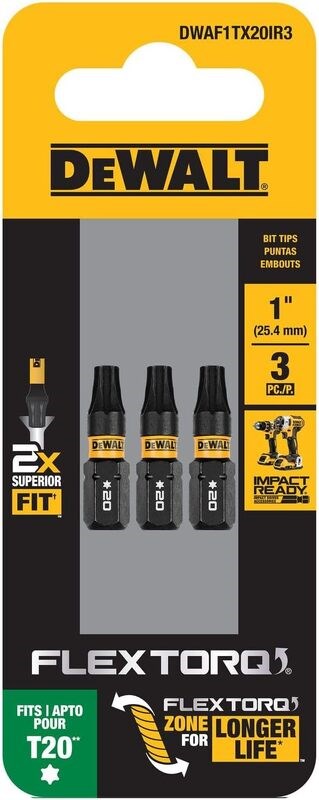 DEWALT FLEXTORQ TORX T20 INSERT BIT - 1", 3PKImpact-rated insert bit engineered with DeWalt FlexTorq technology for superior durability in impact drivers. The engineered flex zone absorbs impact energy for up to 200 times longer bit life, while the CNC-machined Torx T20 tip provides a precise fit and reduces cam-out.