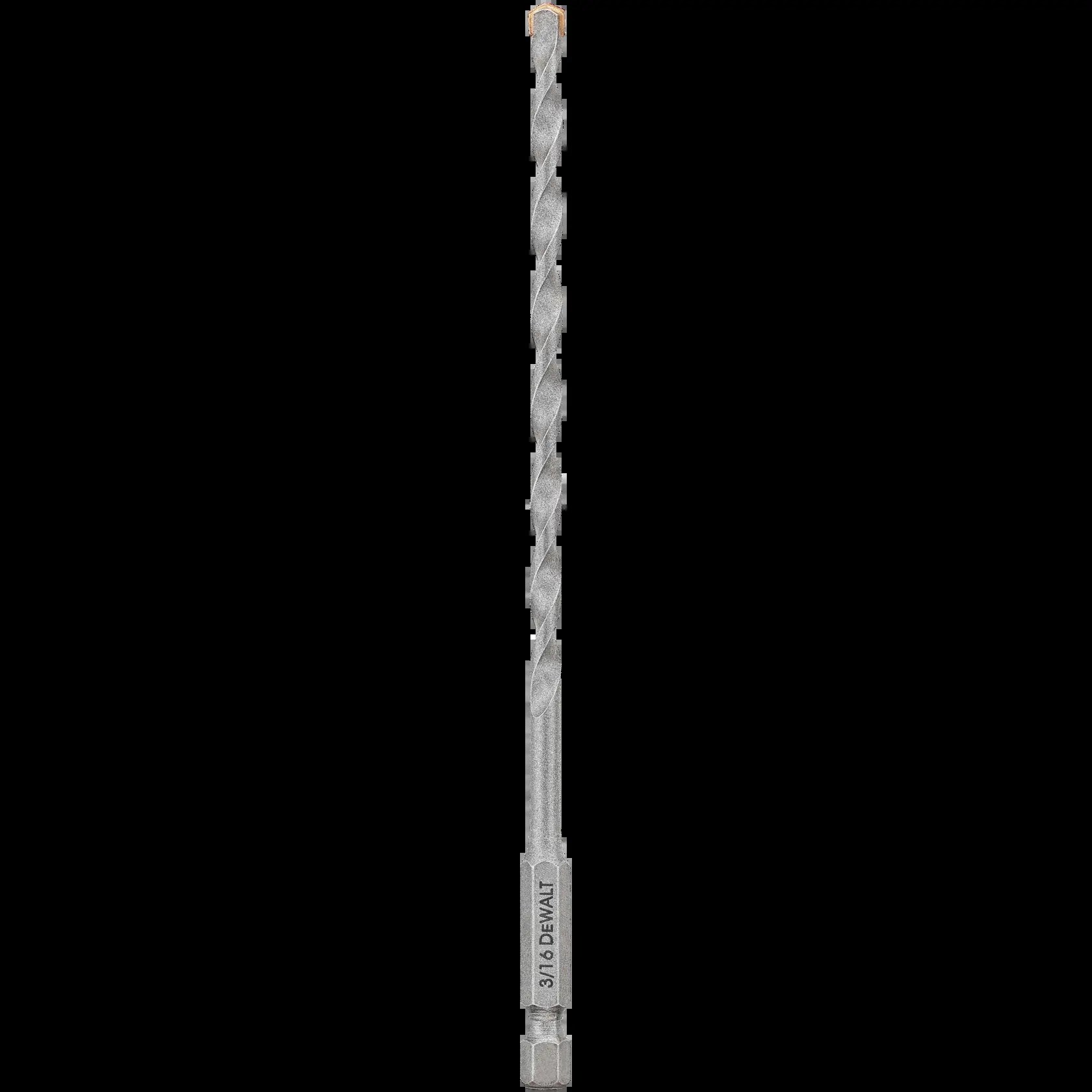 DEWALT IMPACT READY MASONRY DRILL BIT - 3/16"Drill into concrete, brick, and block using your impact driver with this DeWalt Impact Ready masonry bit. The carbide speed tip penetrates masonry materials quickly, while the innovative flute design clears debris faster for easier drilling. The 1/4" hex shank fits directly into any impact driver for quick bit changes without re-chucking.