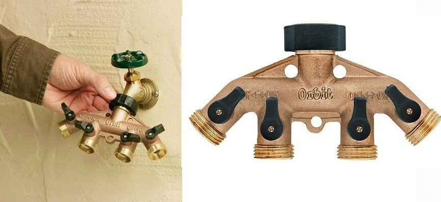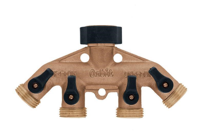 This brass manifold has 4 hose outlets with shut-offs for multiple uses. It is ideal for 1 to 4 sprinkler hose faucet valves or multiple hose connections.