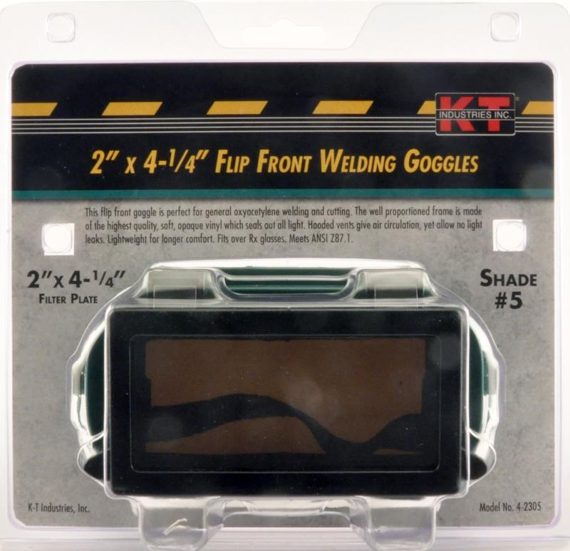 K-T INDUSTRIES SOFT SIDE WELDING GOGGLES - SHADE 5, FLIP FRONTSoft side welding goggles with a #5 filter plate and flip-up front lens for oxy-acetylene welding, torch cutting, and brazing. The flip front lets you check your work without removing the goggles - just flip the dark lens up to reveal a clear lens underneath. The soft green vinyl frame conforms to your face for a snug, light-sealing fit.