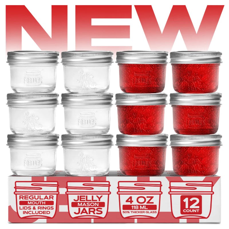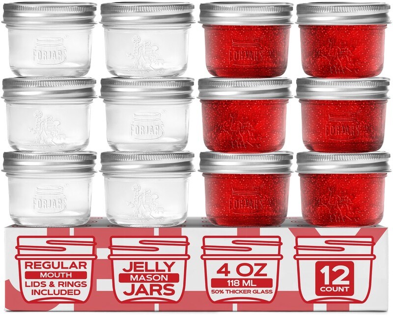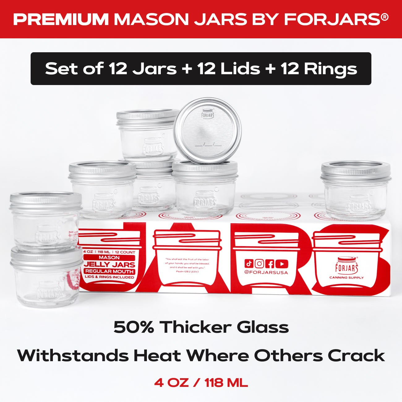 12 PACKPremium glass canning jars from Forjars, ideal for preserving small batches of jams, jellies, sauces, and spices. These 4 oz jars feature thick, lead-free glass that is canner safe for water bath and pressure canning methods.