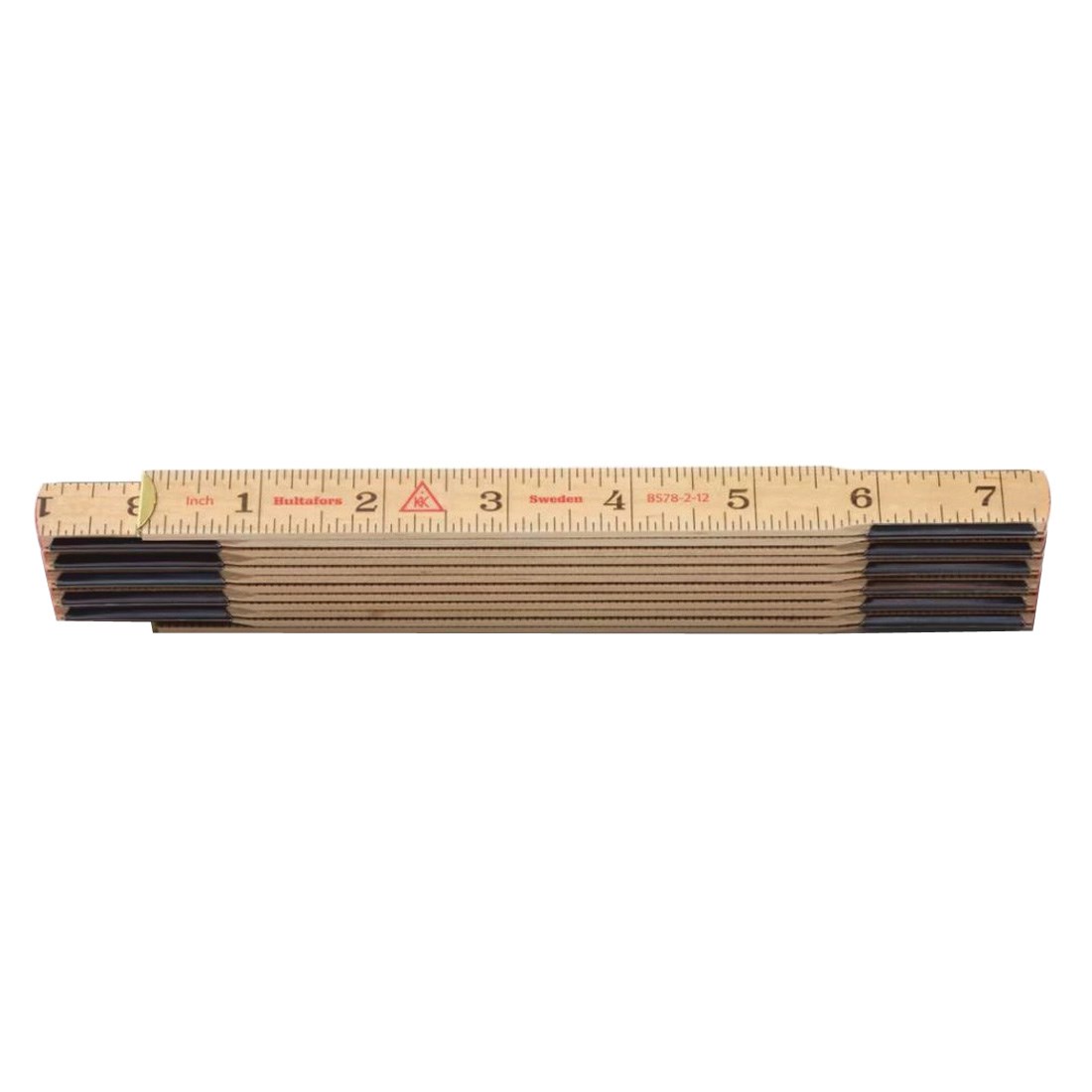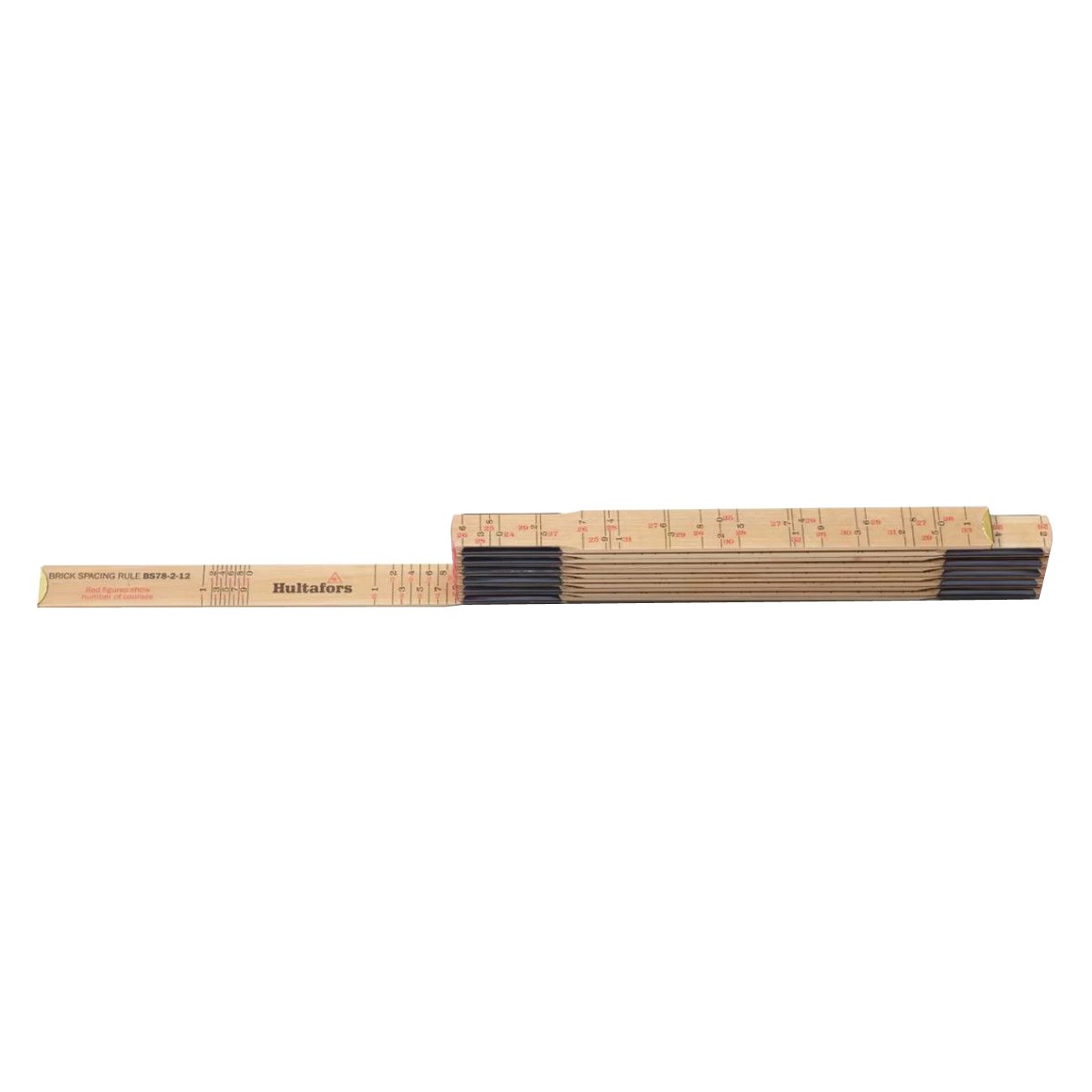 HULTAFORS BRICK SPACING FOLDING RULERA specialty folding ruler designed for brick masons, with brick course spacing markings printed in red along the inside scale. The 6-1/2 ft rule is coated with a water-based protective lacquer for resistance to dirt and moisture on the jobsite.