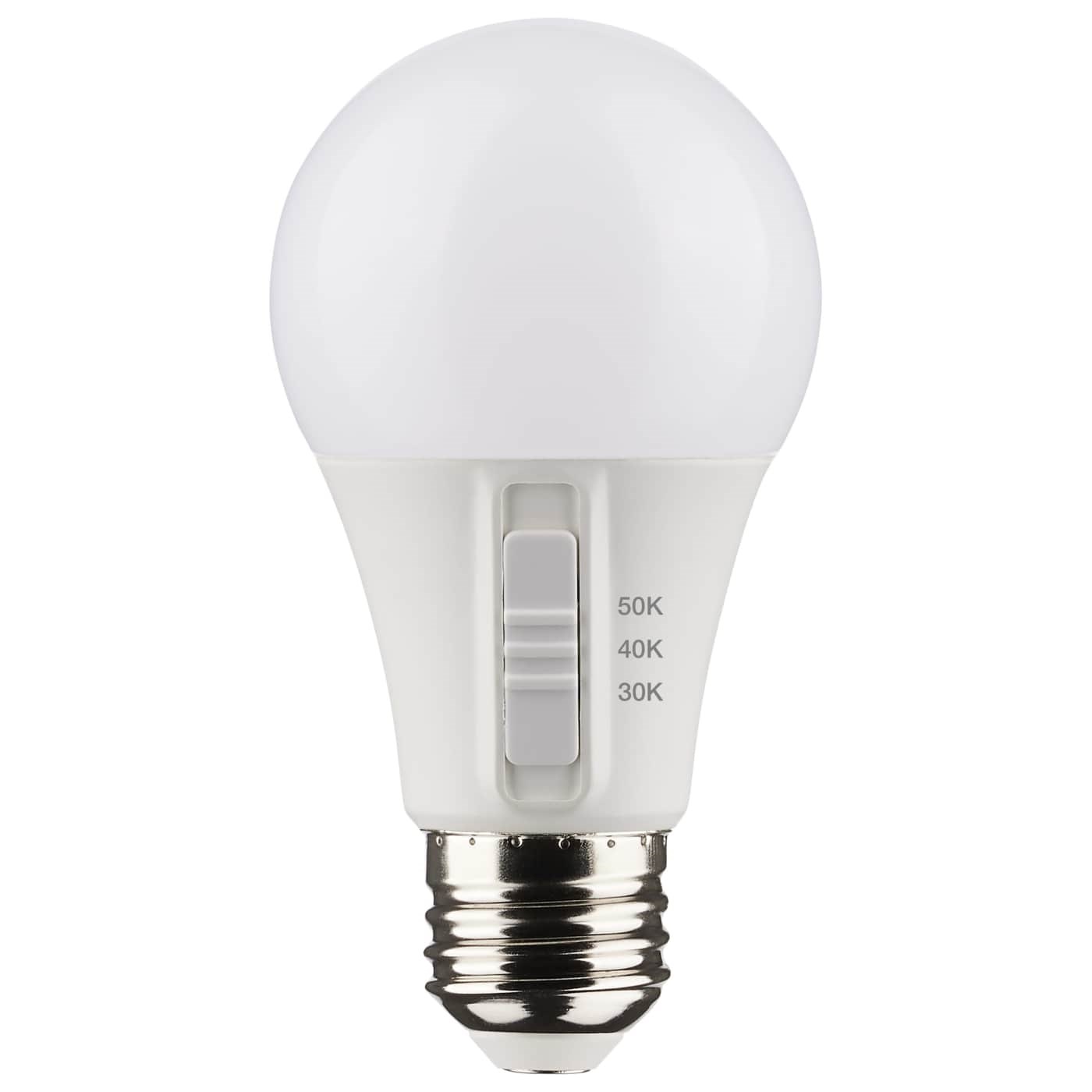 SATCO A19 LED 3CCT SELECTABLE LIGHT BULB - 9W / 800 LUMENS, 4-PACKChoose your preferred light color with one bulb. Each Satco A19 LED features a built-in color temperature switch on the base that lets you select between Warm White (3000K), Cool White (4000K), or Daylight (5000K) before installation. With 90+ CRI for true color rendering and a 220-degree beam angle for wide coverage, each bulb replaces a standard 60W incandescent while using just 9 watts.