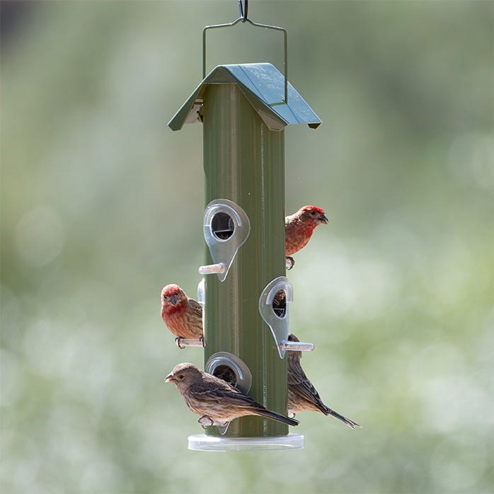 PERKY-PET GREEN METAL TUBE BIRD FEEDER - 1 LBFeed multiple birds at once with this 6-port metal tube feeder from Perky-Pet. The powder-coated steel construction resists rust for long-lasting outdoor use, and the removable perches and base make it easy to clean and maintain. Holds 1 lb of mixed seed or nyjer (thistle).