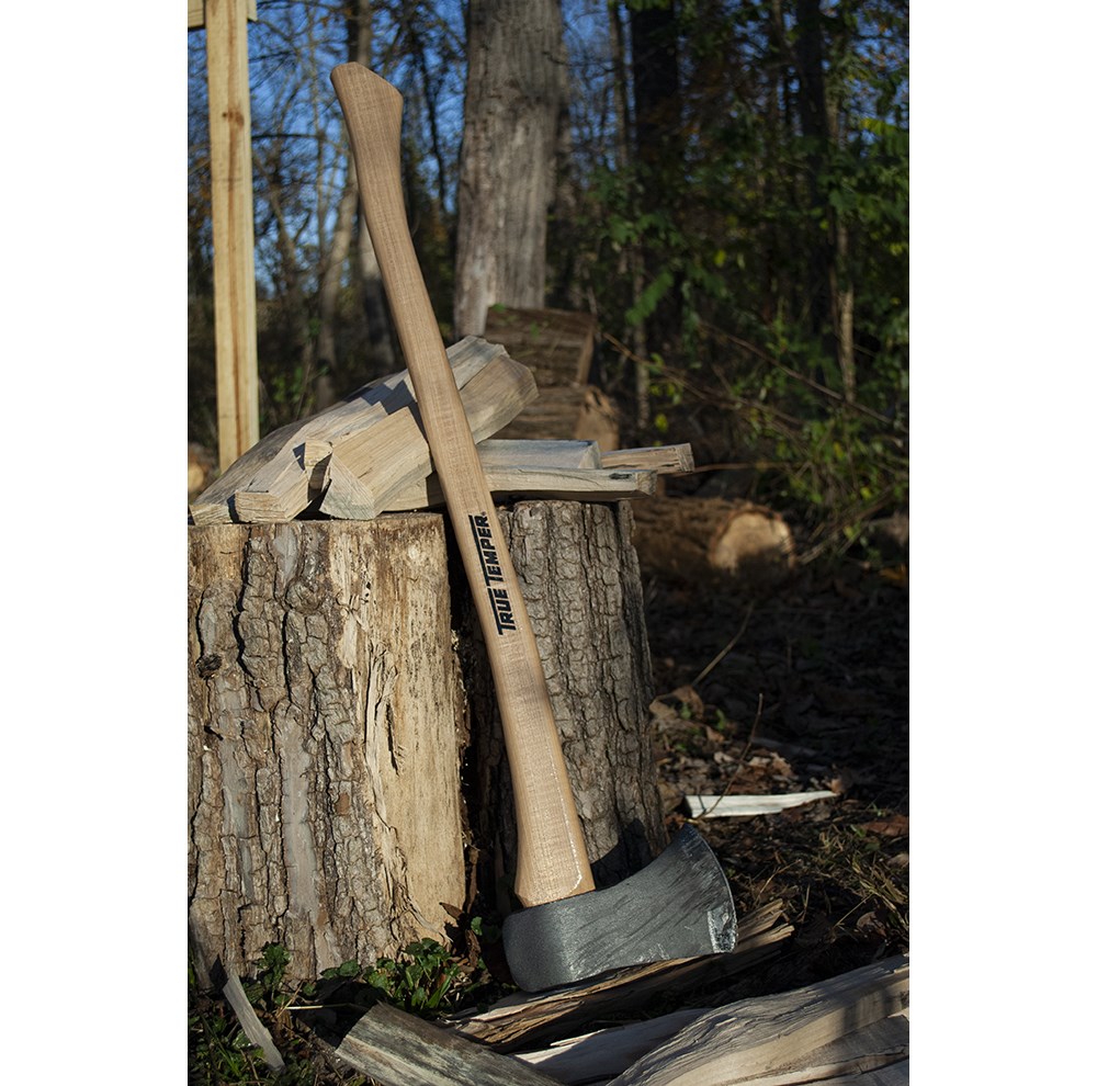 Single bit axe head attached to 36" American Hickory handle to reduce shock