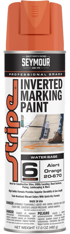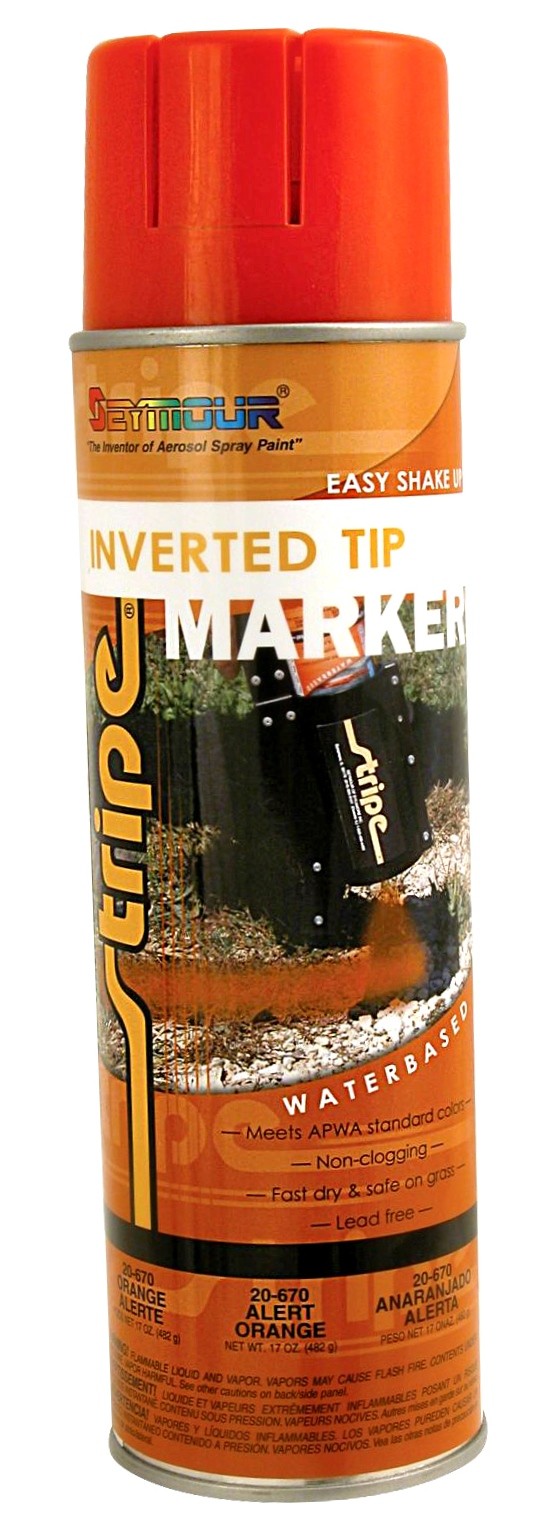 Heavy duty industrial paint with a water base. Designed to use in an inverted position. Environmentally safe; will not damage grass. Lead free. Use for marking construction and excavation sites, underground utility lines, and traffic safety. One hour dry.