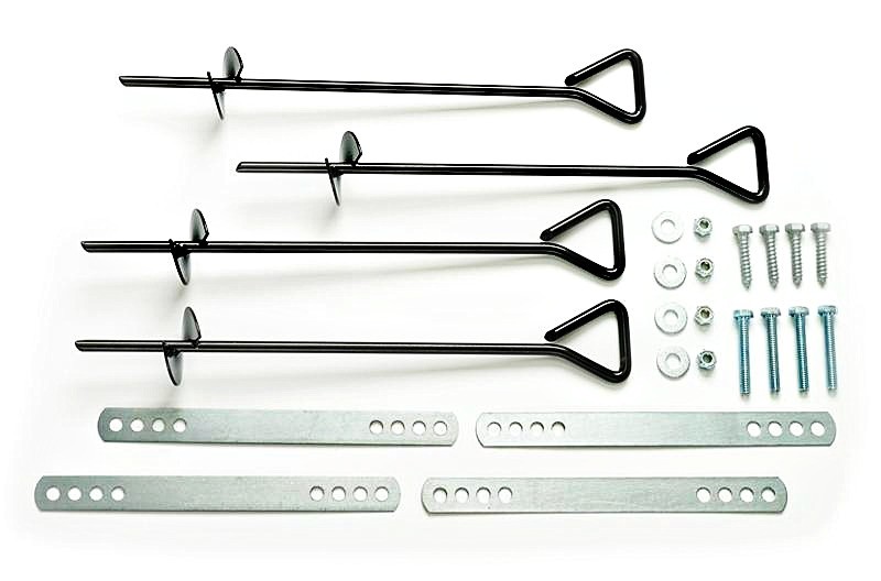 Set comes with (4) powder coated steel anchor stakes, mounting hardware & instructions