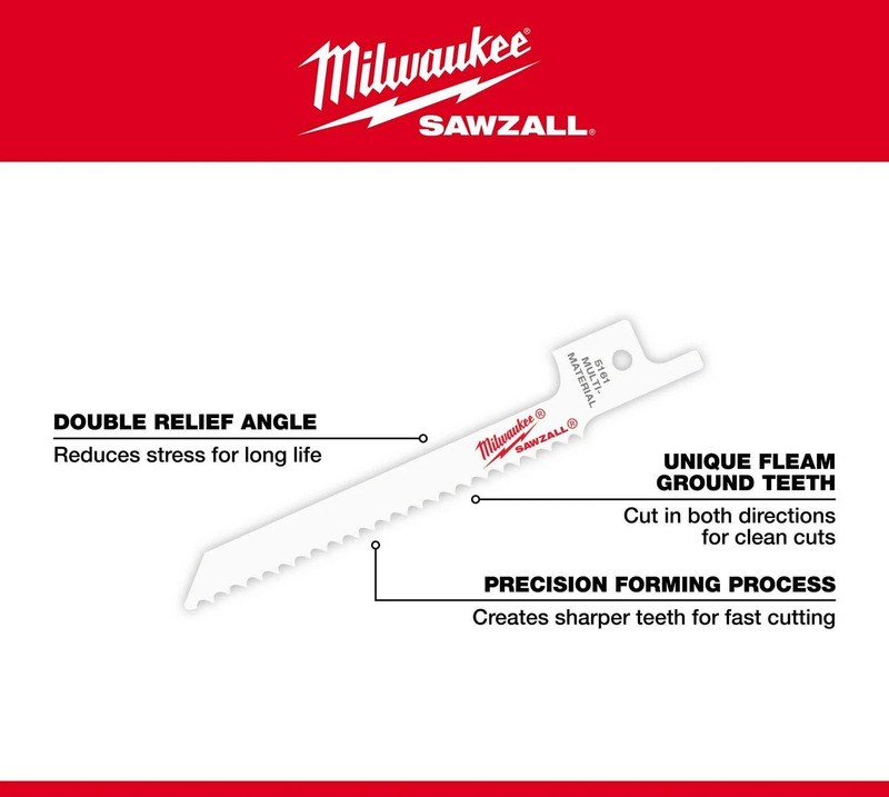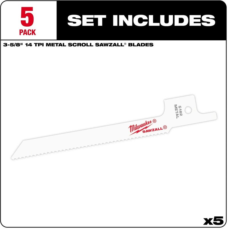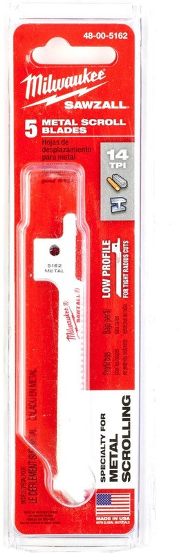 MILWAUKEE SAWZALL BI-METAL SCROLL BLADE - 14 TPI, 5-PACKThis Milwaukee SAWZALL scroll blade is specifically designed for curved and scroll cuts in thin metal. The compact 3-5/8" length and narrow 5/16" width allow tight-radius cuts in sheet metal and thin stock. Matrix II bi-metal teeth with 8% cobalt provide a sharper edge that stays sharp longer.