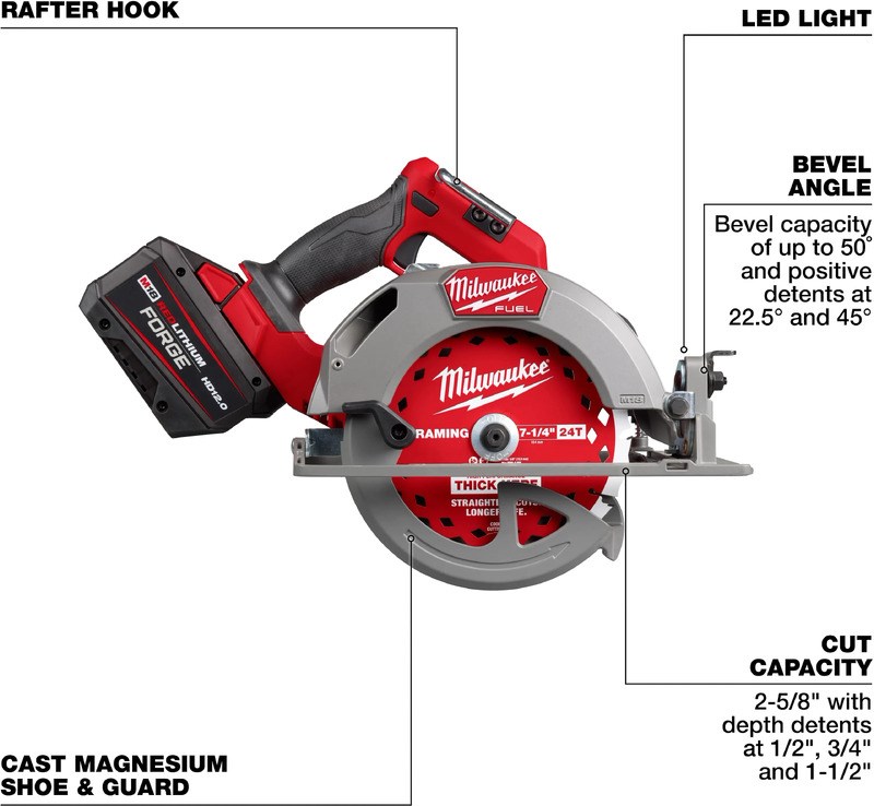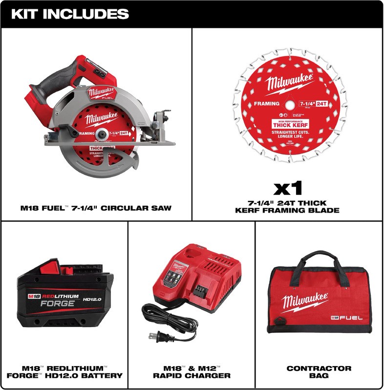 MILWAUKEE M18 FUEL 7-1/4" CIRCULAR SAW KITThe Milwaukee M18 FUEL 7-1/4" circular saw delivers corded-cutting performance with cordless convenience. The POWERSTATE brushless motor spins at 6,000 RPM, and the magnesium shoe and upper guard keep weight down without sacrificing durability. This kit includes the FORGE HD 12.0Ah battery for maximum runtime.