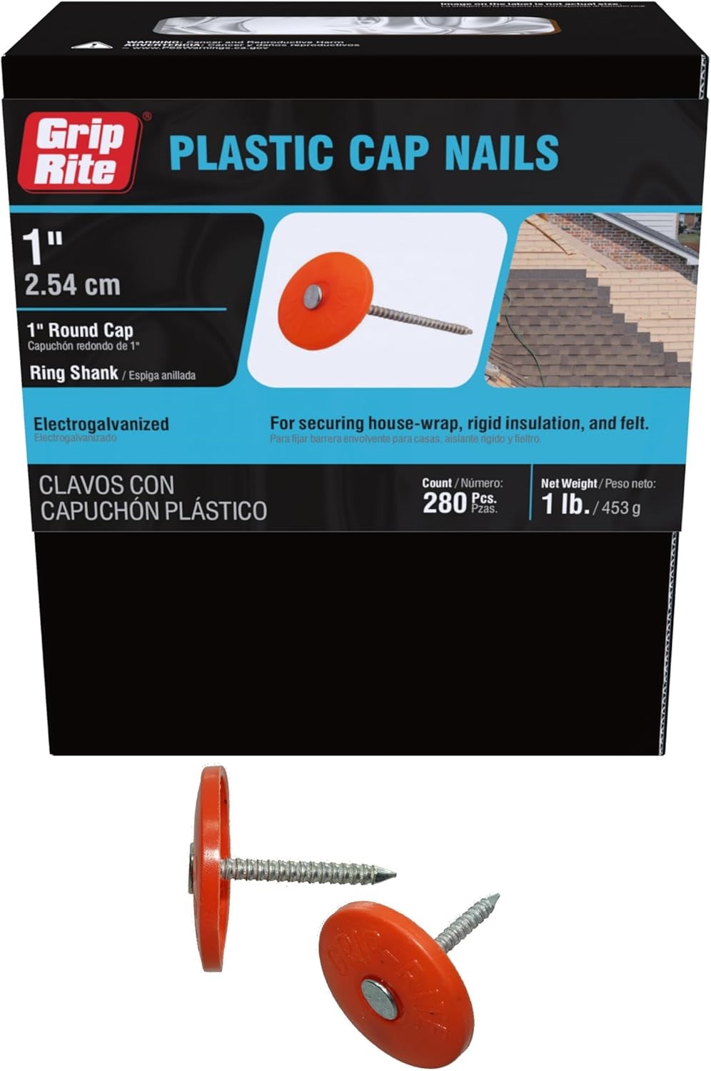 PRIME SOURCE PLASTIC CAP ROOFING NAIL - 1"Prime Source 1" plastic cap roofing nails provide a secure hold for house wrap, rigid insulation, and roofing felt. The round 1" plastic cap distributes force over a wider area to prevent pull-through in soft materials. The ring shank grips wood fibers for superior holding power, and the electro-galvanized coating resists corrosion.