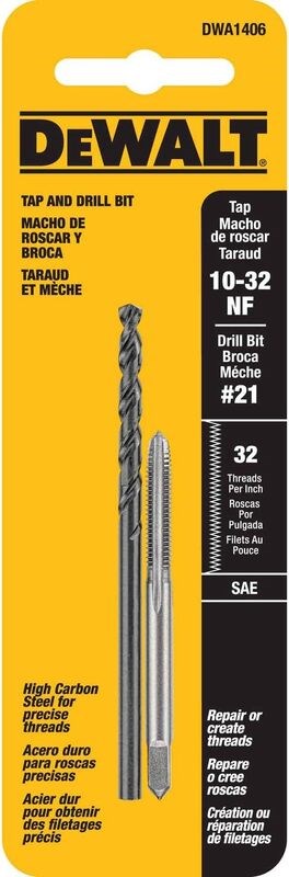 DEWALT DRILL AND TAP SET - 10-32 NFCreate and repair 10-32 NF (National Fine) internal threads in metal with this DeWalt 2-piece drill and tap set. Includes a matched #21 black oxide drill bit and high-carbon steel tap for precise, efficient thread cutting.