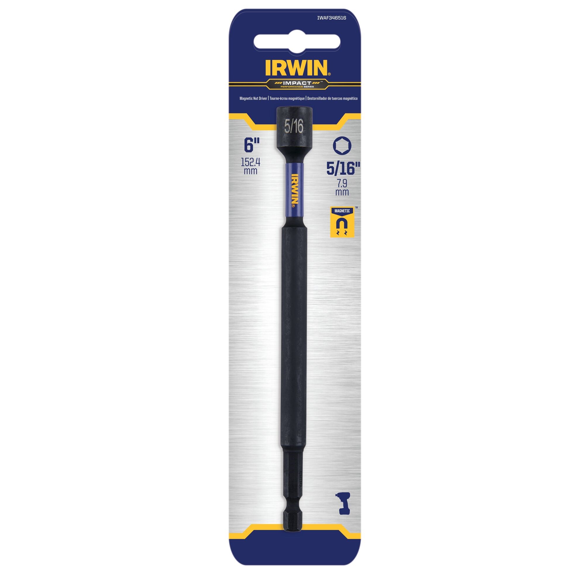 IRWIN IMPACT MAGNETIC NUTSETTER - 5/16" x 6"This Irwin Impact Performance Series magnetic nutsetter delivers maximum durability for use with impact drivers. The lobular design drives fasteners from the side rather than forcing corners to turn, providing more clearance and reducing cam-out.