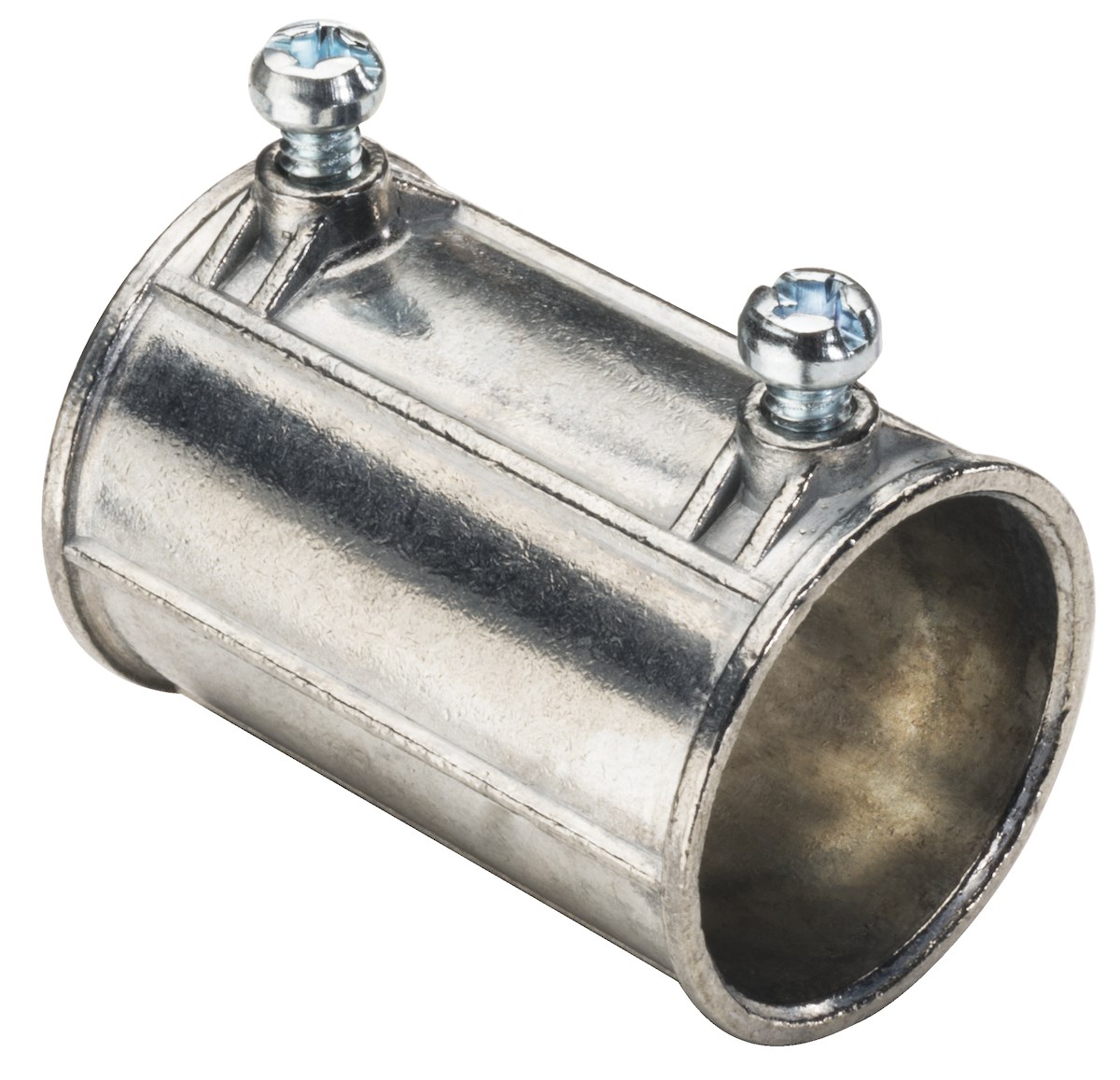 HALEX 1" EMT SET SCREW COUPLINGDie-cast zinc set screw coupling for joining two lengths of 1" EMT (Electrical Metallic Tubing) conduit. Features Tri-Drive screw heads compatible with Phillips, slotted, and square screwdrivers for easy installation.