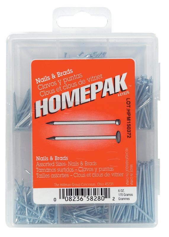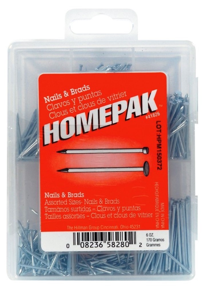 6 oz. package of assortment nails and brads in varying sizes for multiple applications