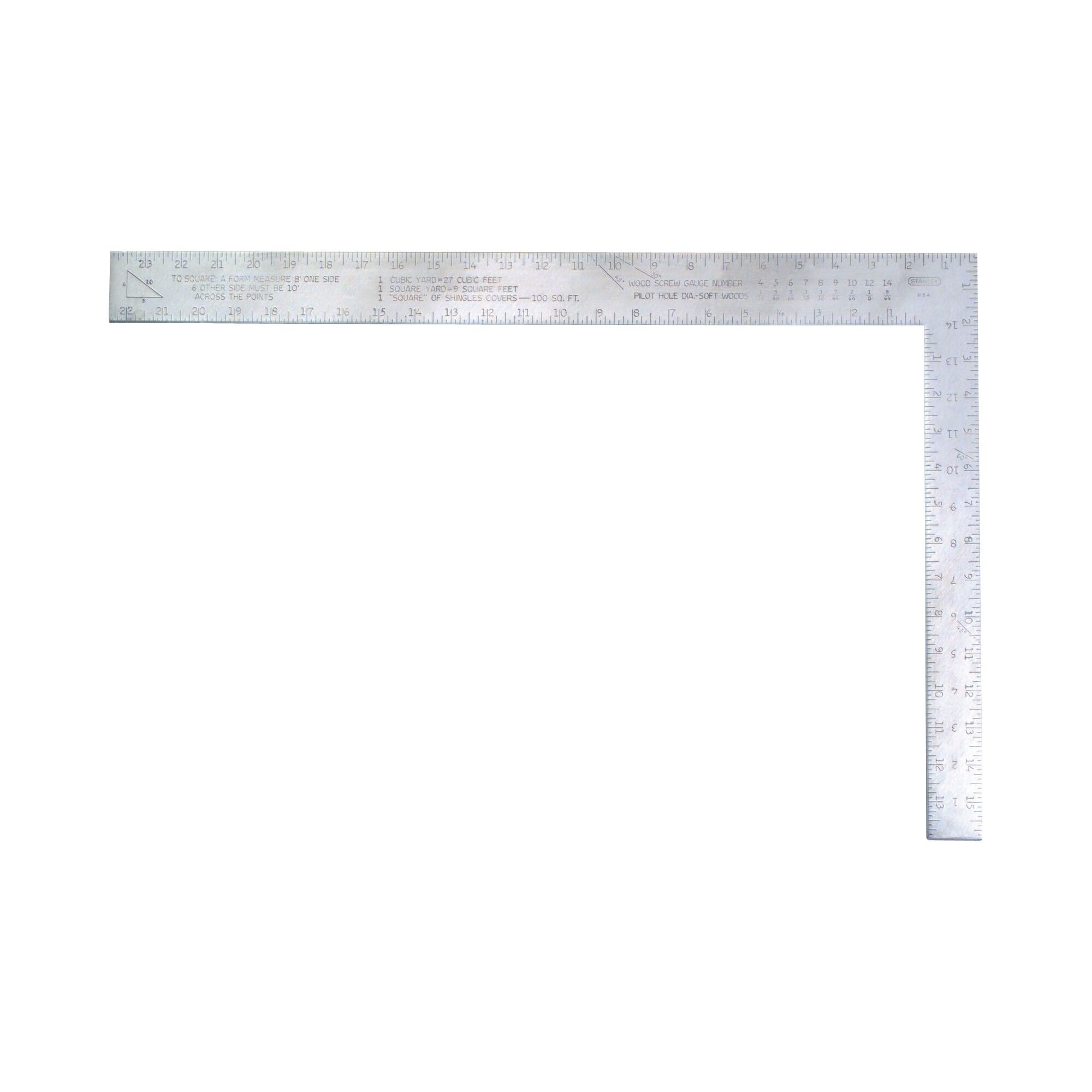 STANLEY ALUMINUM HOMEOWNER'S SQUARE - 24" x 16"Versatile aluminum rafter square with a 24-inch body and 16-inch tongue for layout, marking, and measuring tasks. High-tempered anodized aluminum construction with a buffed finish and protective lacquer coating for corrosion resistance. Deep embossed 1/8-inch graduations on both sides won't wear off like printed markings.