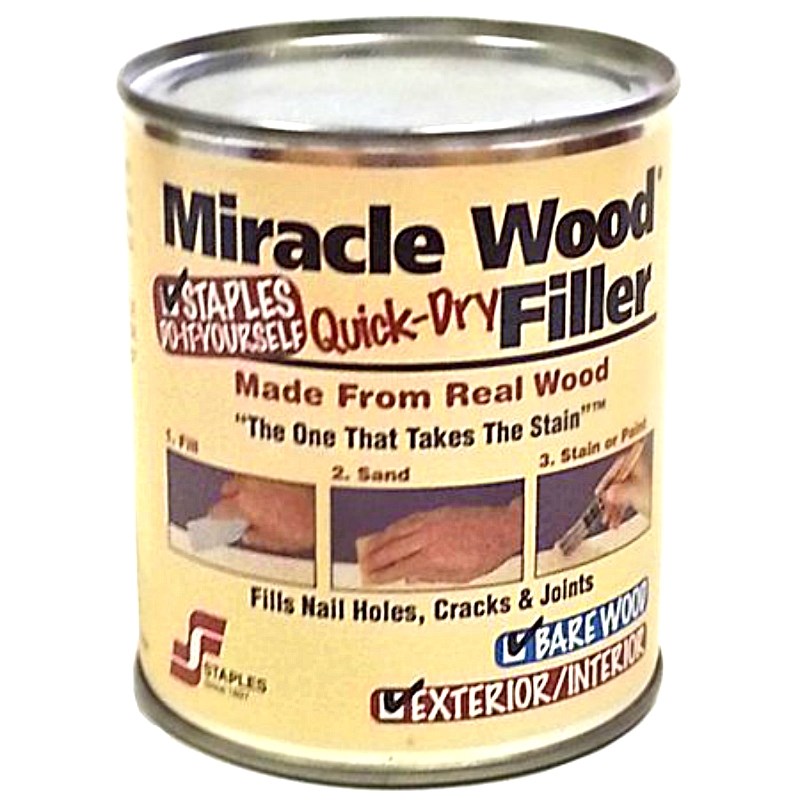 Made from two grades of natural wood fibers and a blend of fillers, Miracle Wood Quick-Dry creates a patch that is strong, yet porous enough to absorb stain to match the surrounding woodwork.