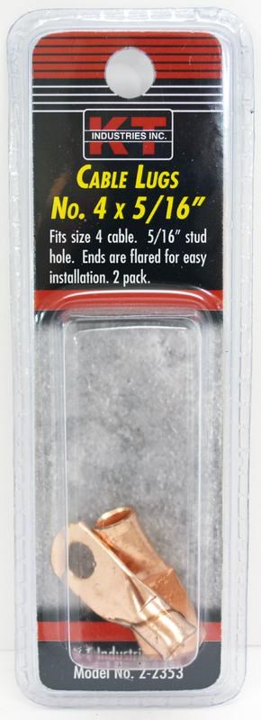 K-T INDUSTRIES COPPER CABLE LUG - 4 AWG x 5/16" STUDThese K-T Industries cable lugs provide a reliable connection for terminating 4 AWG stranded copper wire to a 5/16" stud or bolt. Made from pure copper for excellent electrical conductivity and low resistance in high-amperage applications.