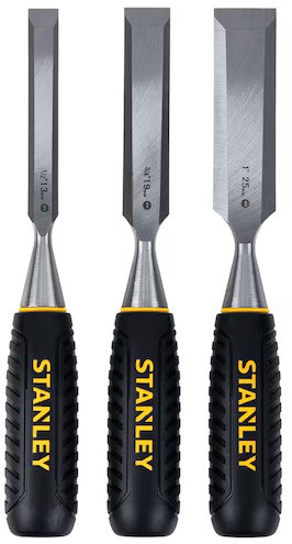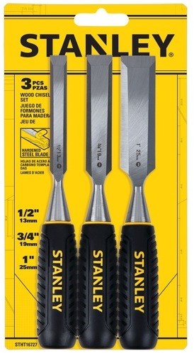STANLEY 3-PIECE WOOD CHISEL SETThis Stanley 150 Series wood chisel set includes three essential sizes for woodworking: 1/2" (13mm), 3/4" (19mm), and 1" (25mm). The short-form blade design provides greater control, strength, and ease of use for detailed work.