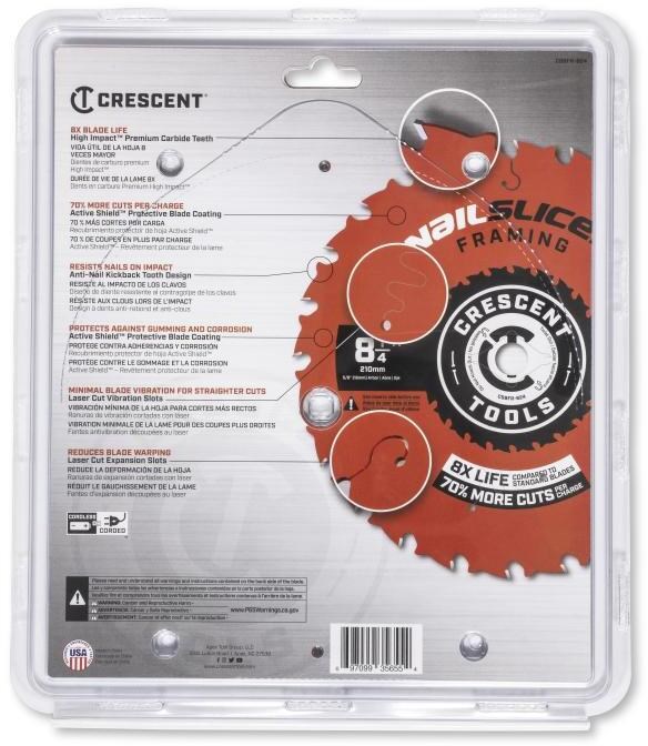 CRESCENT 8-1/4" 24-TOOTH FRAMING CIRCULAR SAW BLADEThe Crescent CSBFR-824 is an 8-1/4" 24-tooth framing circular saw blade engineered for fast, clean cuts through dimensional lumber, studs, and sheet goods. High-impact premium carbide teeth and the Active Shield protective coating help the blade resist heat and wear for longer service life.