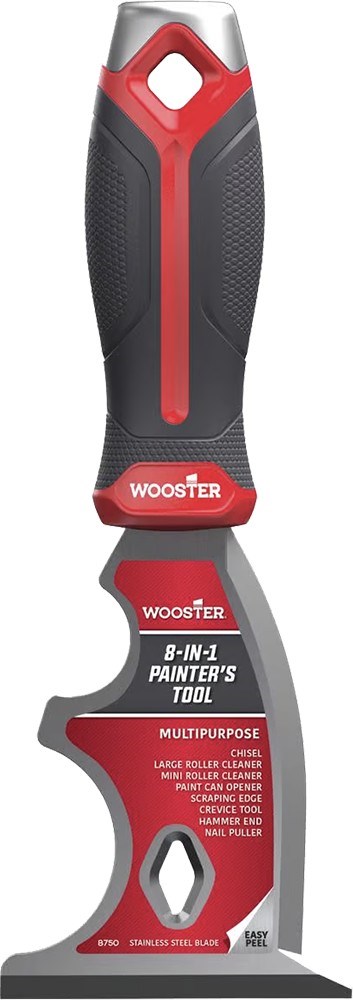 WOOSTER 8-IN-1 PAINTER'S TOOLThis versatile 8-in-1 painter's tool handles virtually every task during paint prep and cleanup. The stiff stainless steel blade resists rust and holds up to heavy scraping, while the non-slip comfort grip reduces hand fatigue during extended use.