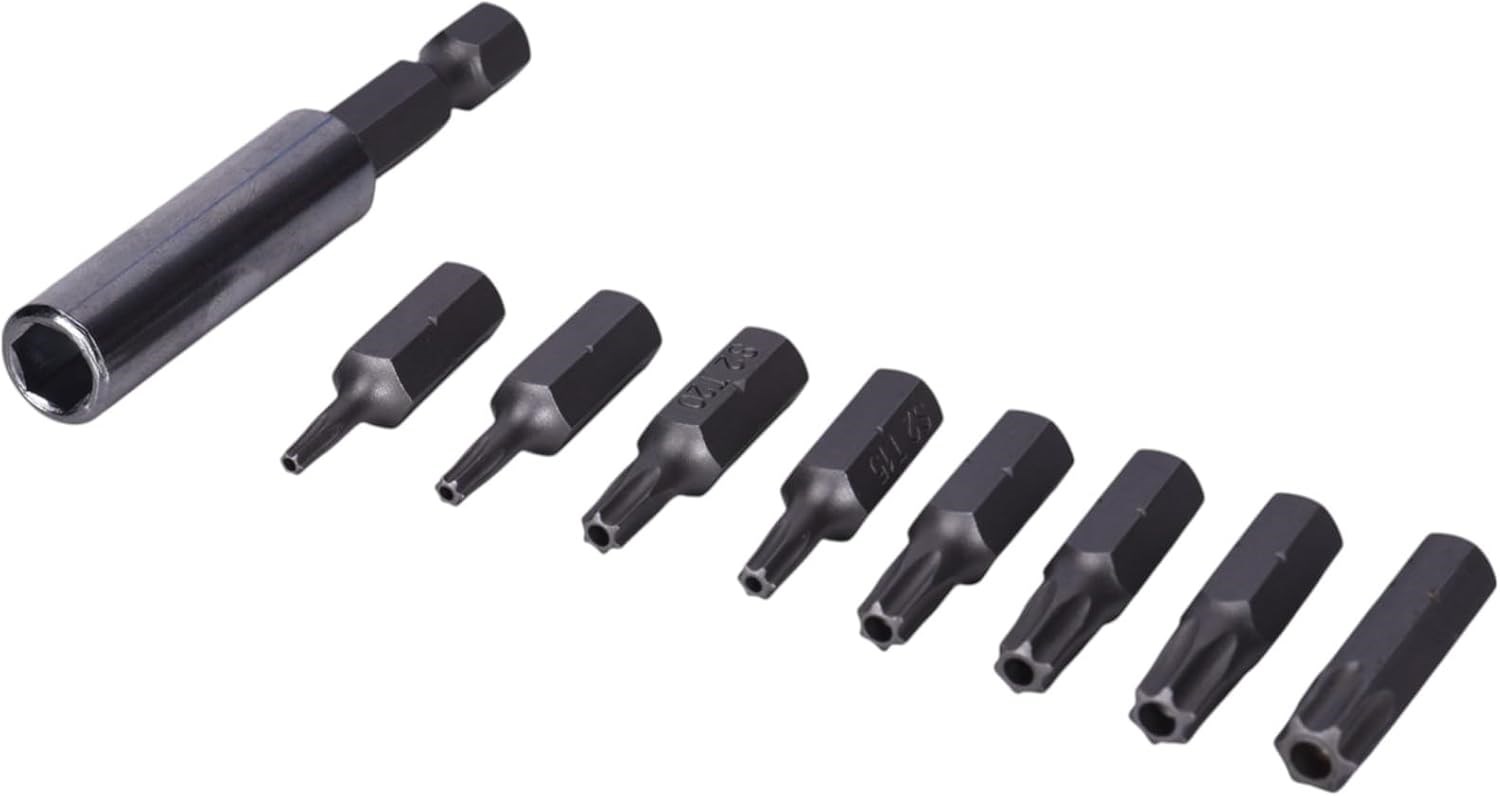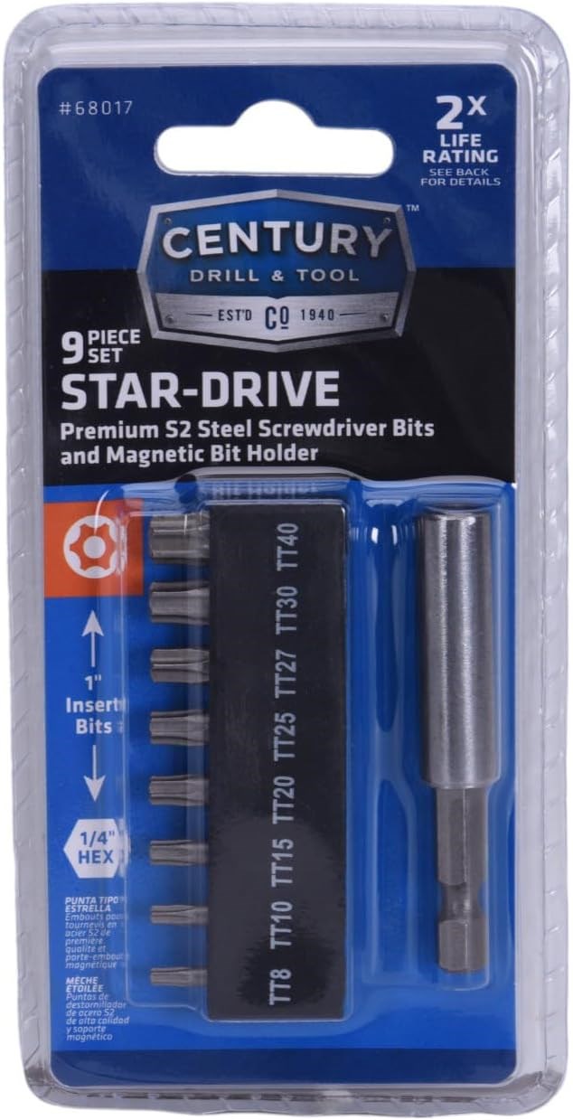 CENTURY 9-PIECE SECURITY STAR-DRIVE BIT SETTamper-resistant security star (Torx) insert bit set for driving security fasteners found in automotive, mobile home, and lawn and garden equipment. Made from premium S2 tool steel for long service life with both common and case-hardened screws.
